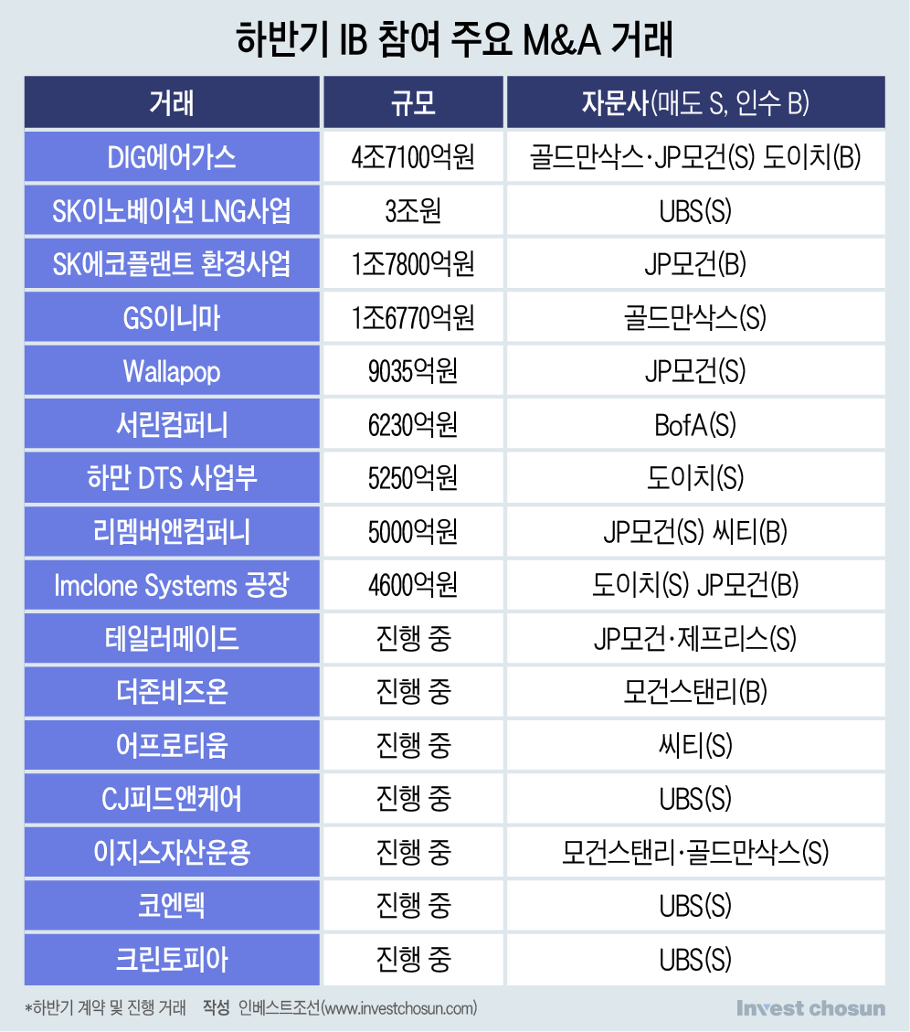 이 외에도 IB들은 외국 고객이 참여한 국경간거래(크로스보더)에서 존재감을 보였다. SK에코플랜트의 환경사업이나 GS이니마, 리멤버앤컴퍼니 M&A는 해외 기업과 PEF가 인수자로 나섰다. SK이노베이션의 LNG 유동화는 국내 증권사가 투자자로 정해졌지만 애초 글로벌 PEF를 염두에 두고 시작된 거래다.