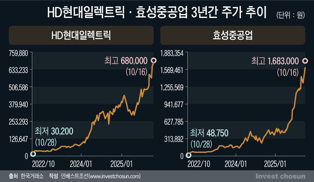 같은 날 효성중공업도 개장 직후 전일보다 7% 가까이 오르며 신고가를 갈아치웠다. 오후 들어 상승분 일부를 반납했지만 최종적으로 5.32% 오른 166만4000원에 마감했다. 몸값이 치솟는 속도 자체는 HD현대일렉트릭보다 가파르다. 지난 6개월 사이 3배 이상, 효성그룹이 계열 분리 계획을 발표한 2024년 2월 기준으로는 10배 이상 주가가 뛰었다. 시총은 약 15조5000억원 수준으로 SK㈜와 엇비슷한 위치까지 올라섰다.
