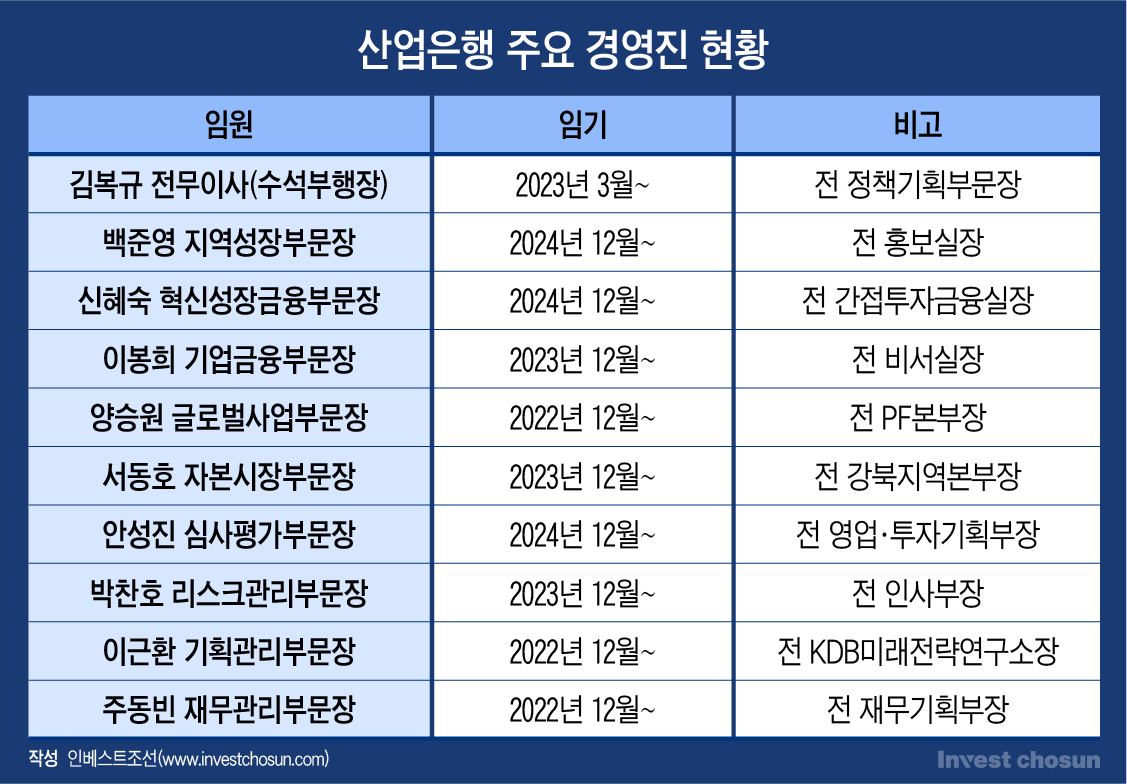 이번 인사에서 또 다른 관전 포인트는 수석부행장 교체 여부다. 현재 김복규 수석부행장은 2023년 취임해 임기 3년을 거의 채워가고 있다. 수석부행장은 회장을 보좌하며 인사·전략·조직 운영을 총괄하는 자리로, 정권 교체 이후 새 국정철학을 반영할 수 있는 인사가 필요하다는 의견이 적지 않다.