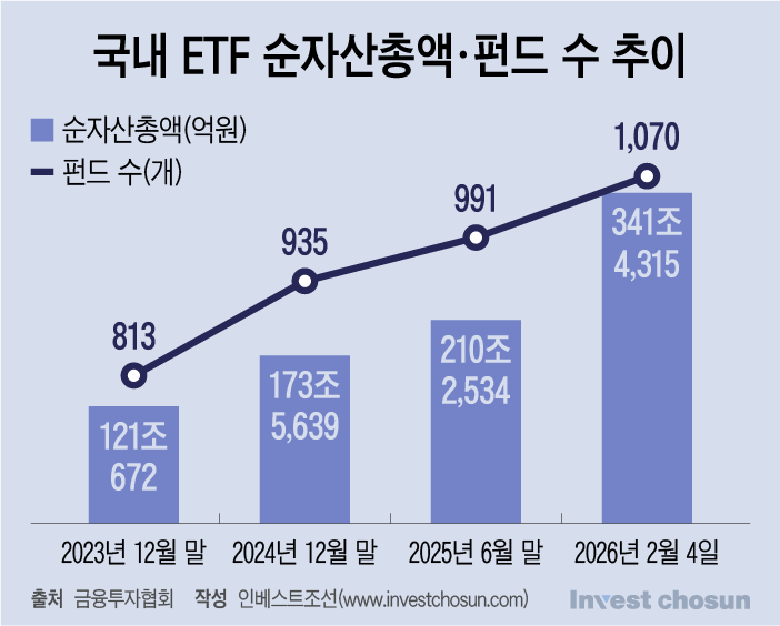 금융투자협회에 따르면 국내 ETF 순자산총액은 2023년 말 121조원 수준에서 이달 초 기준 341조원으로 늘었고, 상장 상품 수 역시 1070개까지 확대됐다. 불과 3년여 만에 순자산과 상품 수가 모두 세 배 가까이 증가한 셈이다.