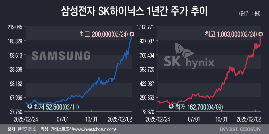 24일 삼성전자 주가는 전일보다 3.63% 오른 20만원, SK하이닉스 주가는 전일보다 5.68% 오른 100만5000원에 마감해 각각 사상 최고가를 갈아치웠다. 양사 주가가 거침없이 상승하는 통에 이날 코스피 역시 전일보다 2.11% 오른 5969.64포인트에 마감하며 '6000피' 달성을 코앞에 두게 됐다.