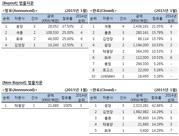 [인베스트조선 2015년 1월 집계][M&A 법률자문 순위]