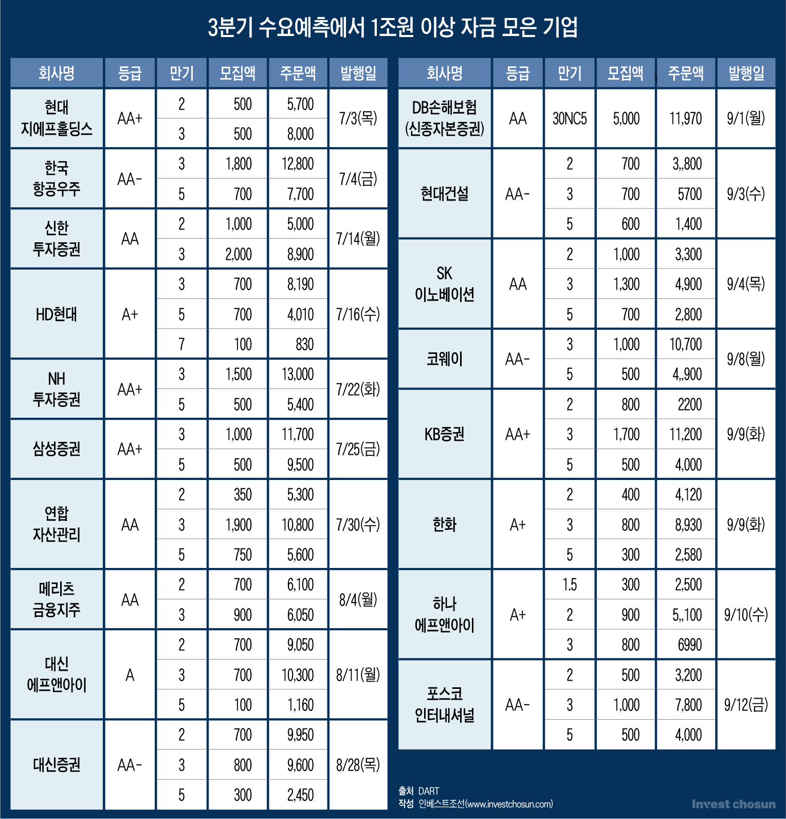 기관투자자 대상 수요예측에서 1조원이 넘는 자금을 모은 기업도 3분기에만 총 18곳이 등장했다. AA급 우량채와 실적이 탄탄한 A급 기업들 위주로 자금이 몰렸다. 미매각은 CJ CGV(A-), JTBC(BBB), 이랜드월드(BBB) 3곳에 불과했다.
