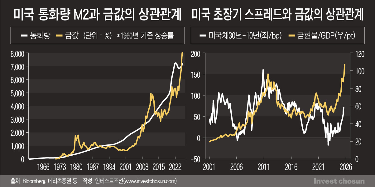 1971년 금태환제 폐지 이후 글로벌 금값은 미국 M2와 밀접한 관련성을 띄어왔다. 달러의 대체상품이자 채굴을 통해 공급량이 달라지는 원자재로써 단기적으로는 큰 변동성을 보이긴 했지만, 결국 크게는 M2가 증가한 수준만큼 금값이 오르는 경향이 뚜렷하게 나타났다.