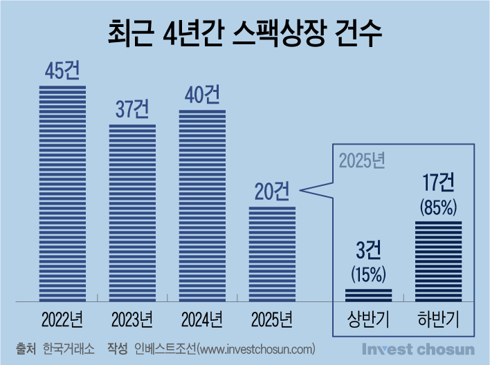 다만 연간 기준으로 보면 반등의 성격은 제한적이다. 15일 기준 올해 스팩 신규 상장은 20건으로, 2022년(45건)과 지난해(40건)의 절반 수준에 그친다. 상장 시점만 하반기로 쏠렸을 뿐, 시장 전체의 공급 규모 자체가 회복 국면에 진입했다고 보기는 어렵다는 해석이 나오는 이유다.