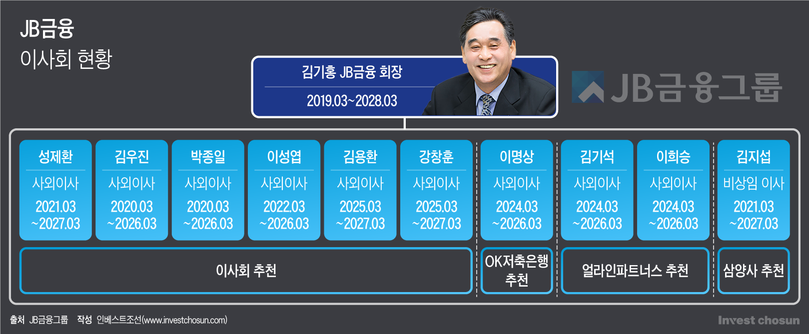 현재 이사회 의장이자 임원후보추천위원장을 맡고 있는 성제환 이사는 김 회장과 학연·지연은 없지만, 2009년 전북은행 사외이사 시절부터 이어진 오랜 인연을 갖고 있다. 김 회장이 JB금융 내에서 입지를 넓혀온 시간과 이사회 핵심 인사의 재임 기간이 상당 부분 겹친다는 점에서, 이사회 독립성에 대한 의문도 함께 제기된다.