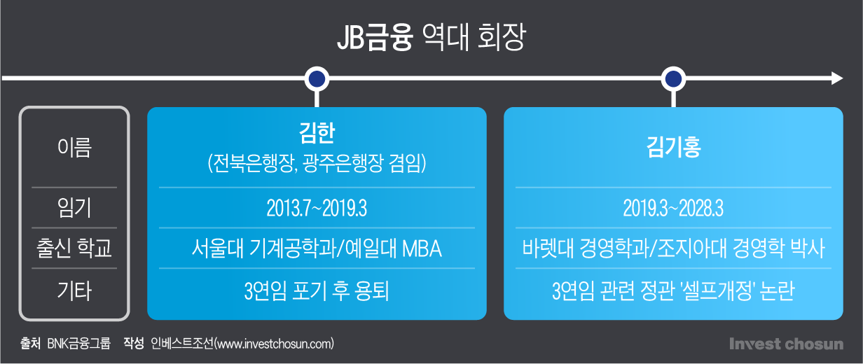 김 회장의 3연임을 두고는 '맞춤형 내규 개정' 의혹도 도마 위에 올랐던 바 있다. 지난해 11월 JB금융은 CEO 연령 제한을 기존 '재임 중 만 70세 미만'에서 '선임 시 만 70세 미만'으로 변경했다. 이에 광주은행 노동조합은 "1957년생인 김 회장의 장기 집권을 위해 빗장을 풀어준 셈"이라며 반발했다.