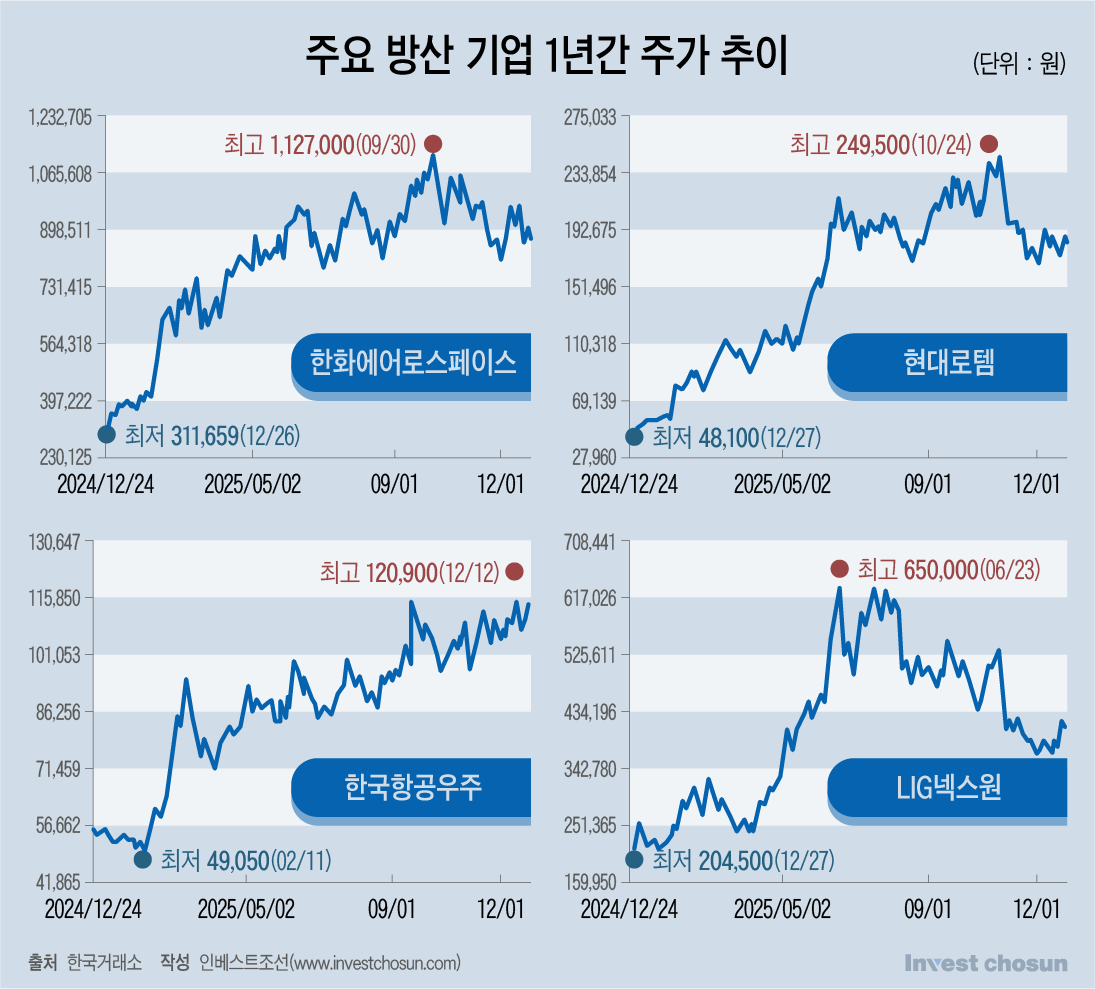 연초부터 12월 말까지 한화에어로스페이스는 151%, LIG넥스원은 64%, 한국항공우주는 104% 뛰었다. 현대로템은 262% 상승했다.