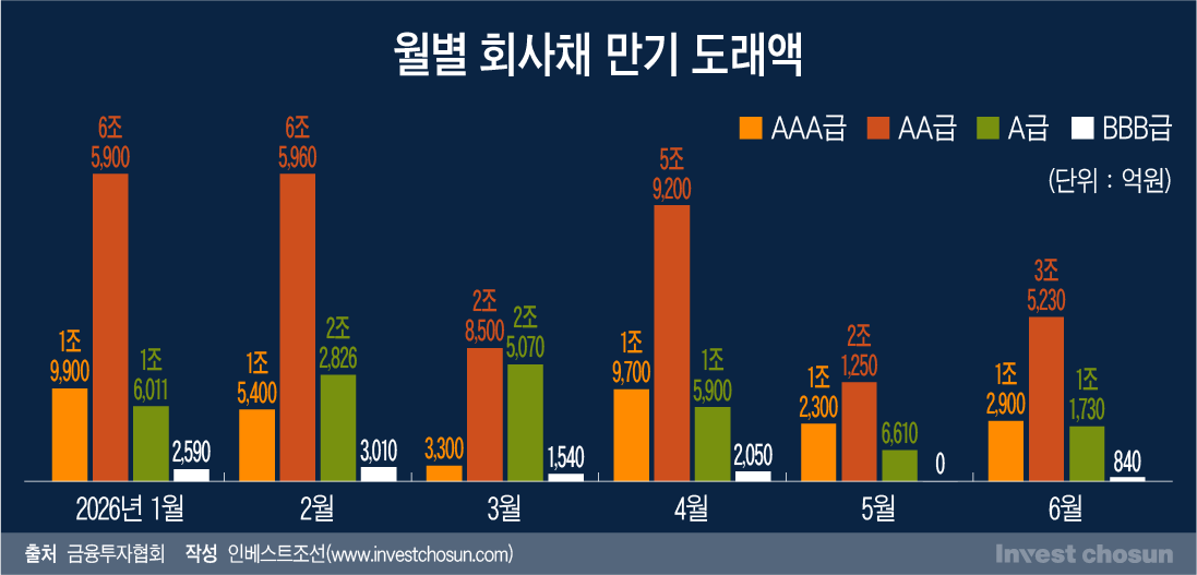 A등급 회사채의 만기는 오는 3월(2조5070억원)에 가장 많이 분포돼 있다. 다만 종합투자계좌(IMA) 도입 기대, 신규 발행어음 북 편입 등 수급 여건 개선 요인이 거론되면서 일부 기업은 선제적 차환 발행에 나설 가능성도 거론된다.