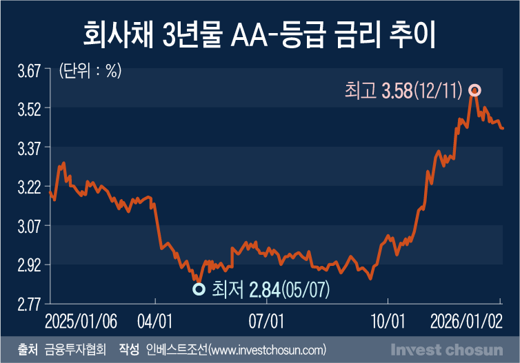 다만 금리 수준에 대한 부담은 여전히 크다는 평가다. 한국은행의 기준금리 인하 시점 지연에 국고채 금리가 상승하면서다. 국고채 3년물 금리는 지난해 상반기만 해도 2.4%대를 오르내리다 지난달엔 3.1%를 돌파하며 연중 최고치를 경신했다. 이후 소폭 하락해 6일 종가 기준 국고채 3년물 금리는 2.949%, 회사채 3년물 AA-등급 금리는 3.445%로 집계됐다.