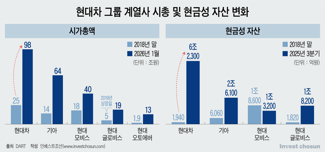 지금은 상황이 다르다. 분할·합병, 사업부 이전 등 주주들의 반발에 부딪힐 만한 복잡한 작업 대신 단순히 계열사간 지분을 사고파는 전략도 충분히 고려해볼만하다는 평가다. 현대차를 중심으로 한 그룹사들의 실적은 매분기 사상 최대치를 경신하고 있고, 이를 통해 각 계열사별 현금성 자산이 눈에 띄게 늘어나고 있다.