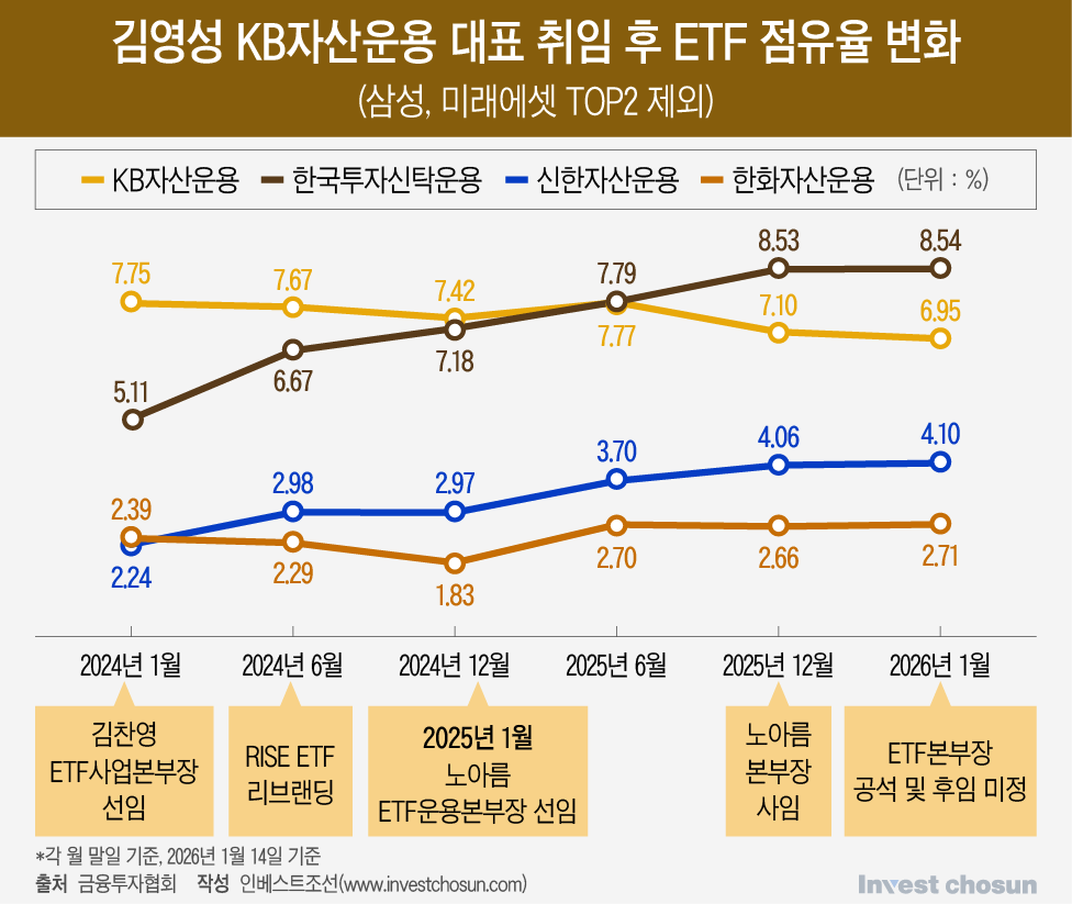금융투자협회에 따르면 KB자산운용의 ETF 시장 점유율은 김영성 대표가 취임하던 2024년 1월 7.75%를 기록했다. 이후 ETF사업본부 출범과 함께 외부 인사인 김찬영 본부장을 영입했지만, 같은 해 6월 말 점유율은 7.67%로 오히려 낮아졌다.