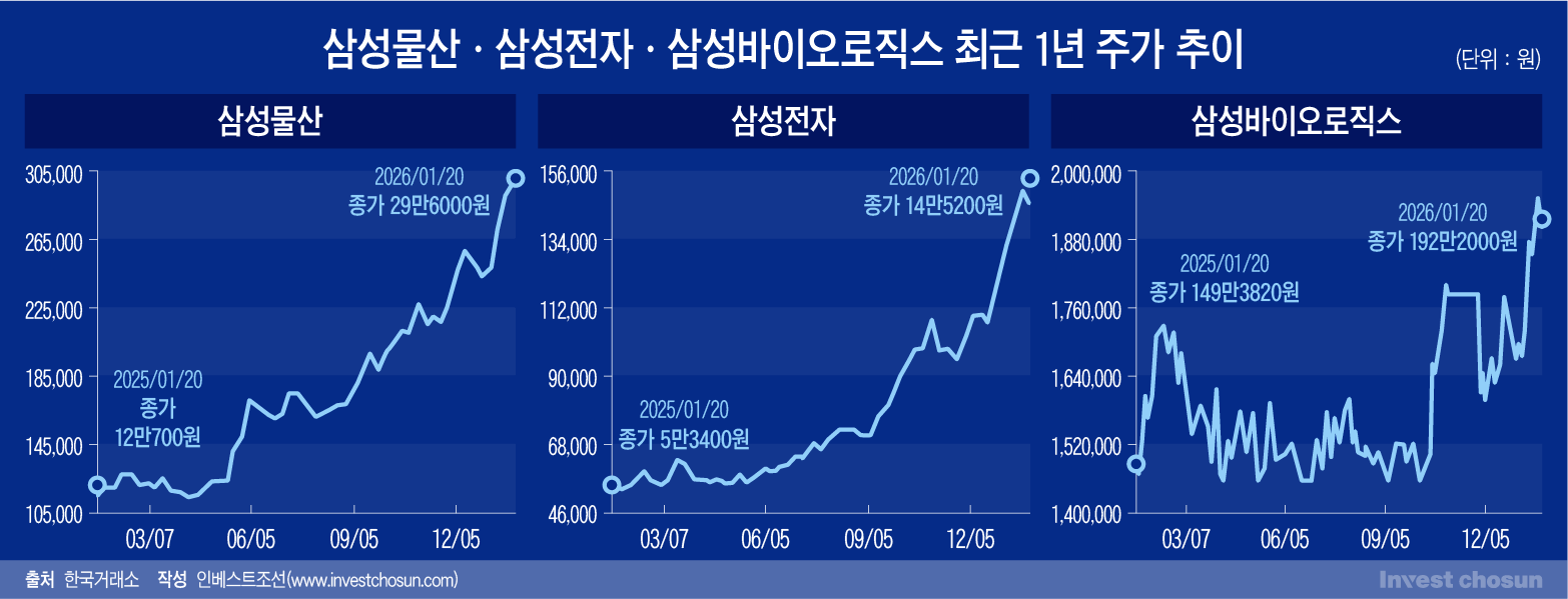 증권가에서는 삼성물산의 목표주가를 일제히 올리며 올해도 상승세가 지속될 것으로 점치는 분위기다. 삼성전자와 삼성바이오로직스 등 삼성물산이 지분을 보유한 상장사 가치가 커지면서 삼성물산의 주가 고점을 끌어올리고 있기 때문이다.