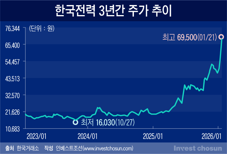 21일 한국전력 주가는 장중 6만9500원까지 오르며 역대 최고가를 갈아치운 뒤 전일보다 3.82% 오른 6만7900원에 마감했다. 전 거래일 16% 폭등한 뒤로도 상승세를 이어가는 것이다. 올해 들어서만 40% 이상 주가가 올랐는데, 국내외 증권가에선 아직 상승 여력이 남아 있다는 분석을 내놓고 있다.