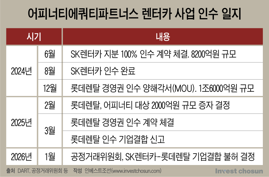 어피너티는 작년 3월 롯데렌탈 인수 계약을 체결한 후 공정거래위원회에 기업결합을 신고했다. 이르면 작년 상반기 중 심사가 끝날 것이란 전망도 있었지만 결국 해를 넘겼고 지난 26일 기업결합 금지로 결론이 났다. 공정위는 두 회사의 결합이 국내 렌터카 시장의 가격 인상 등 경쟁을 실질적으로 제한할 우려가 크다고 판단했다.