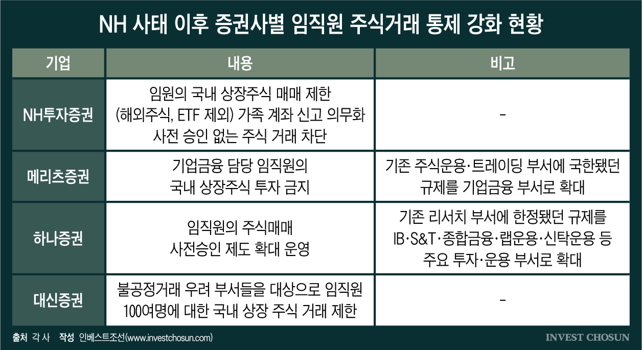 업계 전반의 흐름도 빠르게 바뀌고 있다. NH투자증권을 비롯해 메리츠증권, 대신증권, 하나증권 등은 계좌 모니터링을 강화하거나 사전 승인 절차를 확대하고, 일부 부서에 대해선 개별 주식 투자를 제한하는 등 통제 수위를 끌어올리고 있다.