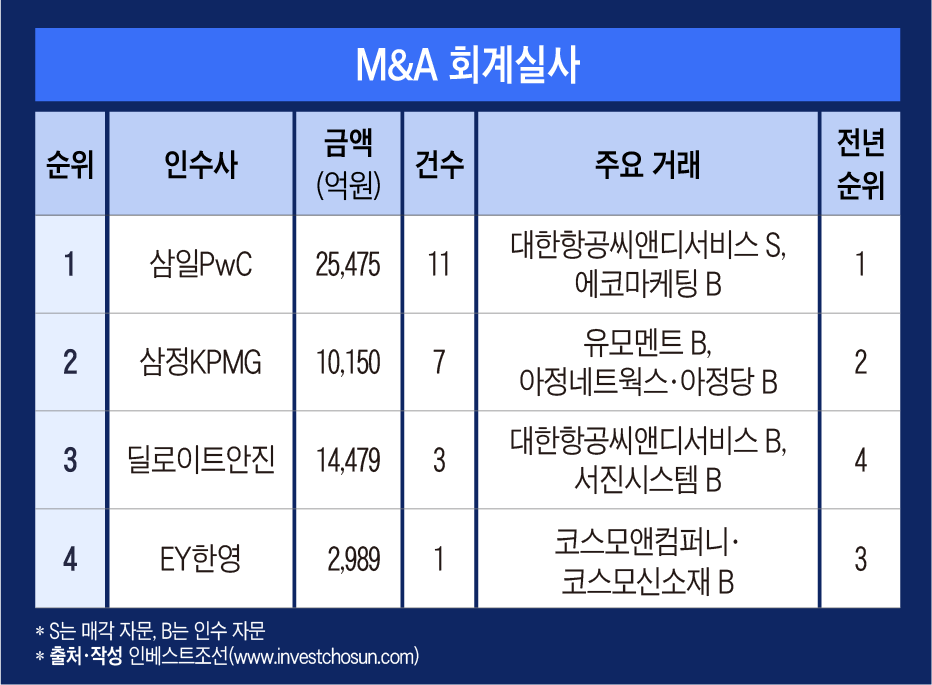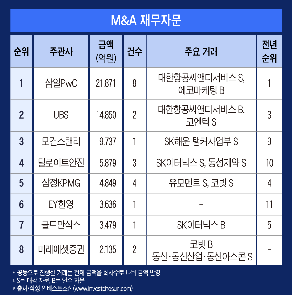 M&A 재무자문에선 삼일PwC가 1위를 기록했다. 한앤컴퍼니의 대한항공씨앤디서비스 매각, 베인캐피탈의 에코마케팅 인수를 자문했다. 작년 말부터 투자자 교체와 풋옵션 행사를 고민하던 서진시스템 재무적투자자(FI)들의 회수 작업도 도왔다. 집계 막판 KES환경개발 경영권 거래까지 성사시키며 연초부터 선두로 나섰다.