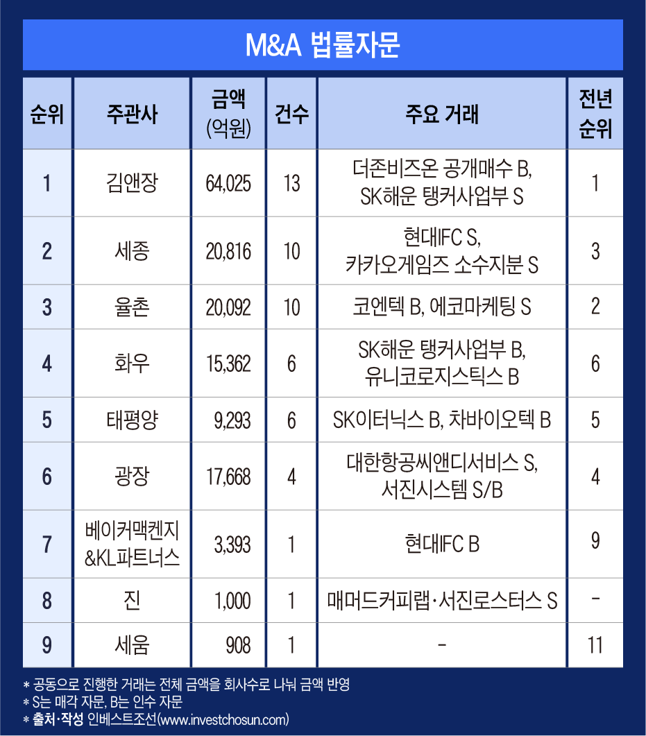 김앤장은 올해도 법률자문 시장에서 1위로 출발했다. EQT파트너스의 더존비즈온 공개매수부터 E&F PE의 코엔텍 매각, SK그룹의 SK이터닉스 매각까지 주요 거래에 고르게 참여했다. 작년 SK해운의 벌크선 사업에 이어 이번 탱커선 사업 매각도 도왔다. 미국 미리캐피탈매니지먼트의 스틱인베스트먼트 지분 인수를 자문한 것도 눈길을 끈다.