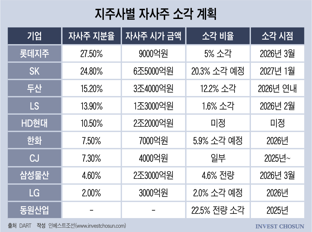 주요 지주사의 자사주 지분율을 보면 지난해 말 기준 롯데지주(27.5%), SK(24.8%), 두산(15.2%), LS(13.9%), HD현대(10.5%), 한화(7.5%) 등의 순으로 나타났다. 자사주 비중이 높은 기업일수록 소각 과정에서 재무 여력 축소와 지배구조 유연성 저하를 동시에 감내해야 한다.