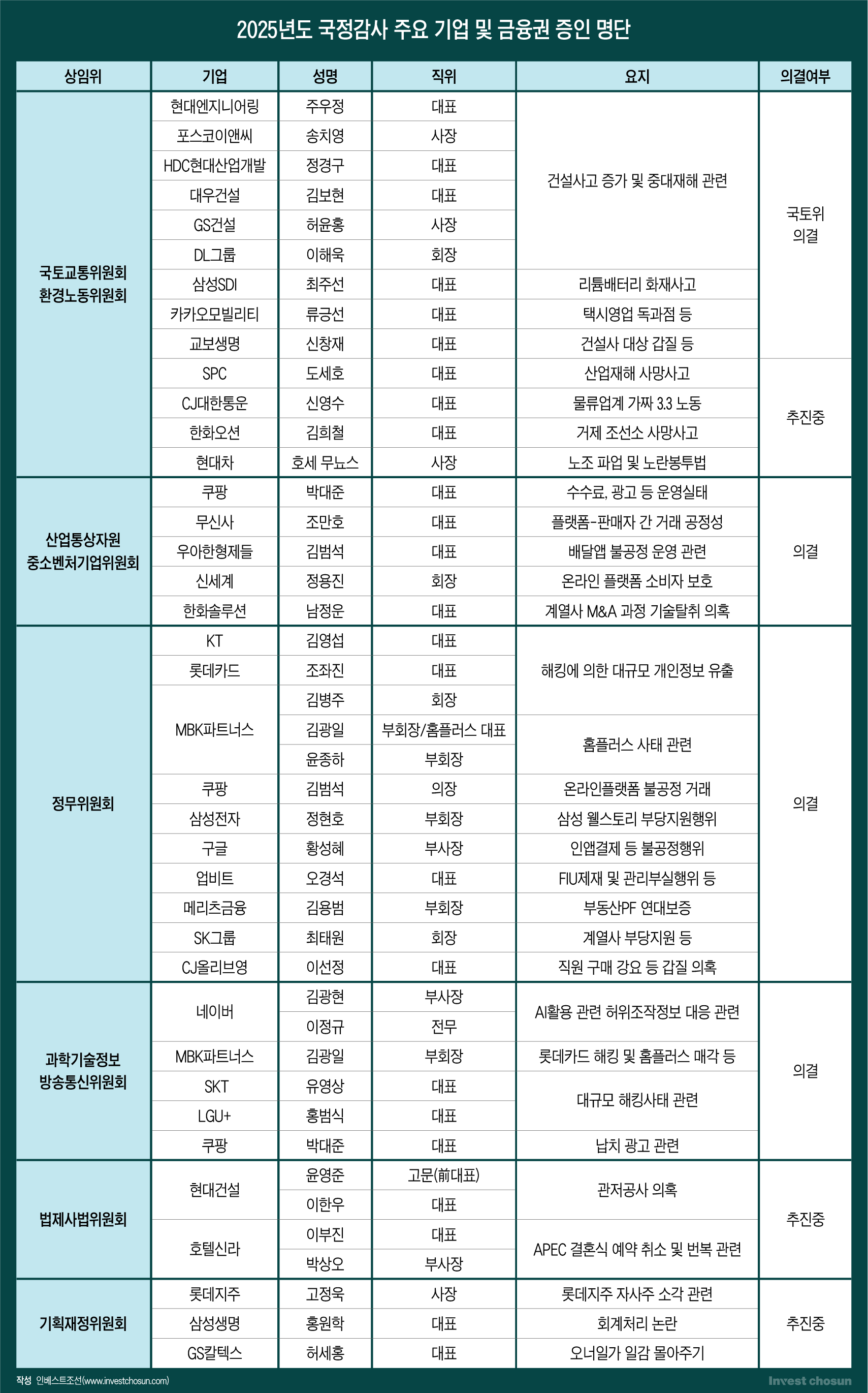 이밖에도 현대건설(관저공사 의혹), 호텔신라(APEC 결혼식 논란), 롯데지주(자사주 소각), SPC(산재 사망) 등은 최종 명단 확정을 앞두고 수면 아래 조율이 한창이다.