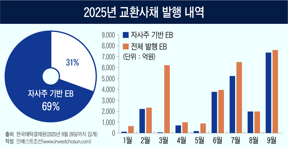 이 같은 기류 속에 9월 EB 발행은 급증했다. 올 9월 한 달 동안만 발행한 자사주 기반 EB는 7381억원으로 올해 발행한 자사주 기반 EB의 3분의 1에 달한다. 3차 상법개정안이 통과되기 전 자사주를 활용하기 위한 움직임으로 풀이된다. 이스트소프트와 신성토탈을 제외한 9월 발행 EB는 모두 자사주 기반으로 이뤄졌다.