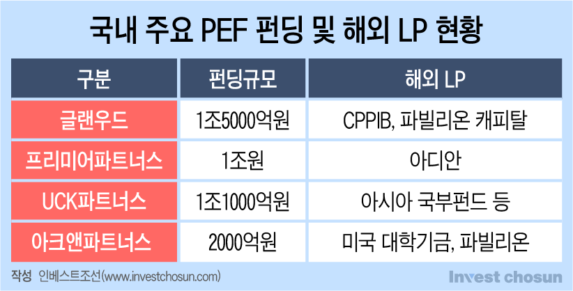국내 주요 PEF(사모펀드)들이 연이어 블라인드 펀드 조성을 마무리하며 ‘성적표’를 받아들고 있다. 눈에 띄는 변화는 과거 MBK파트너스, 한앤컴퍼니, IMM프라이빗에쿼티 같은 메가펀드의 전유물로 여겨졌던 해외 LP(출자자) 유치에 중견·신생 하우스들까지 성공하고 있다는 점이다. 해외 자금 유치가 중요한 점은 장기적으로 펀드 규모를 키우고 메가펀드로 성장하는 데 필수 불가결한 자양분이기 때문이다.