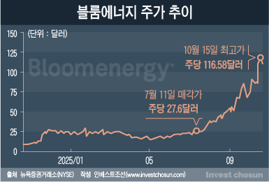 지난 3개월 동안 블룸에너지 주가는 320% 이상 올랐다. 최근 2거래일 동안 주춤했으나 직전인 15일(현지시간) 종가 기준 116.58달러를 기록하며 사상 최고가를 경신했다. 인공지능(AI)과 같은 전방 산업에 천문학적인 투자금이 몰리면서 연료전지 등 에너지 인프라 산업의 가치가 크게 부상한 덕으로 풀이된다.