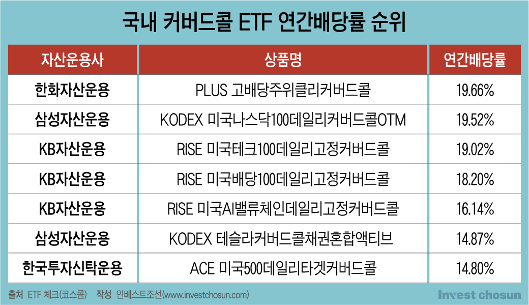 이 같은 고분배율을 추종하는 흐름은 특정 운용사에 국한되지 않는다. 금융투자업계에 따르면 한화자산운용의 'PLUS 고배당주위클리커버드콜'은 연 19.66%, 삼성자산운용의 'KODEX 미국나스닥100데일리커버드콜OTM'은 연 19.52%로 연 20%에 육박한다.