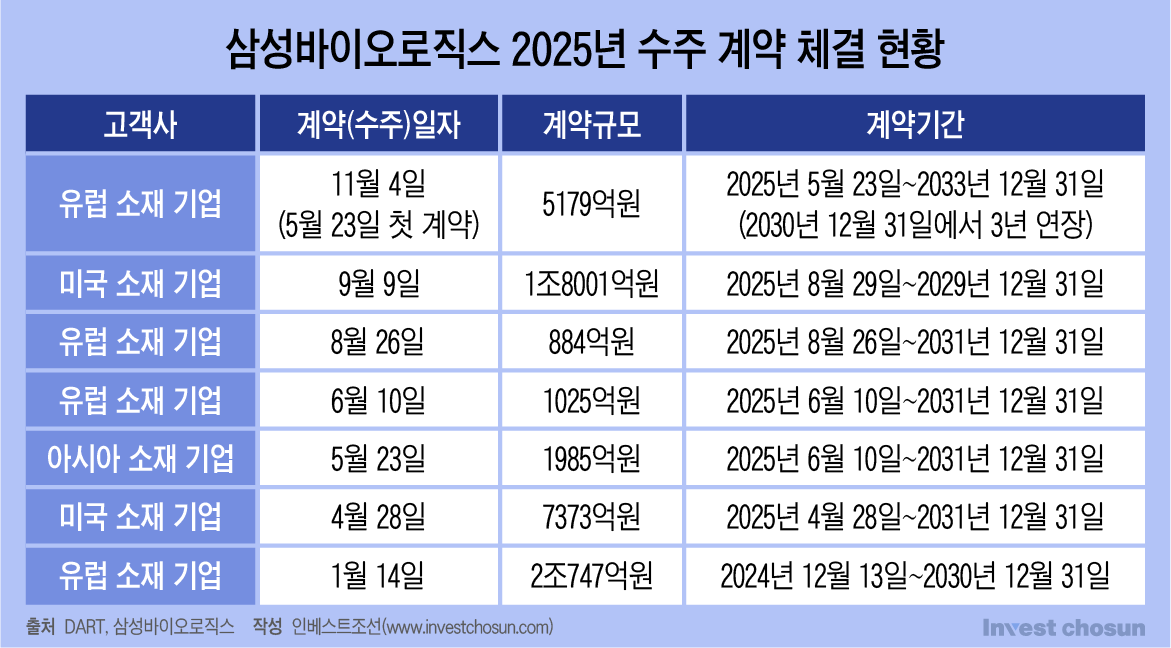 기록 경신의 배경에는 삼성바이오로직스가 올해 체결한 여러 건의 수주 계약들이 있다. 삼성바이오로직스는 올해 1월 유럽 소재 기업과 2조원대 수주 계약을 체결한 뒤, 북미와 아시아 소재 기업과도 적게는 800억원대, 많게는 2조원에 가까운 규모의 수주 계약을 성사했다. 여기에는 신규 계약 외 증액 계약도 포함돼 있다. 통상 계약 기간이 5년 정도라는 점을 고려하면 삼성바이오로직스는 올해 체결한 계약들로 수년간의 먹거리를 확보하게 된다.