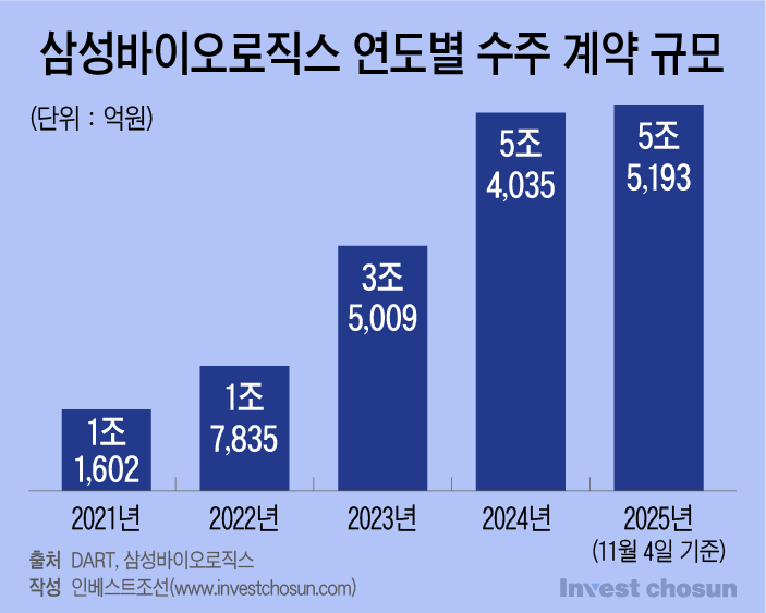 바이오의약품 위탁개발생산(CDMO)기업인 삼성바이오로직스가 수주 규모를 빠르게 키우고 있다. 올해 북미, 유럽 소재 빅파마들과 새로운 수주 계약을 체결하거나 기존에 체결한 수주 계약의 규모를 증액하기로 결정하면서다. 삼성바이오로직스에 따르면 지난 11월 4일까지 공시된 내용을 기준으로 이 회사의 누적 수주 규모는 5조5193억원에 달한다. 삼성바이오로직스가 지난해 5조4000억원대의 누적 수주를 기록했다는 점을 고려하면 연말이 되기 전 종전의 기록을 갈아치운 셈이다.