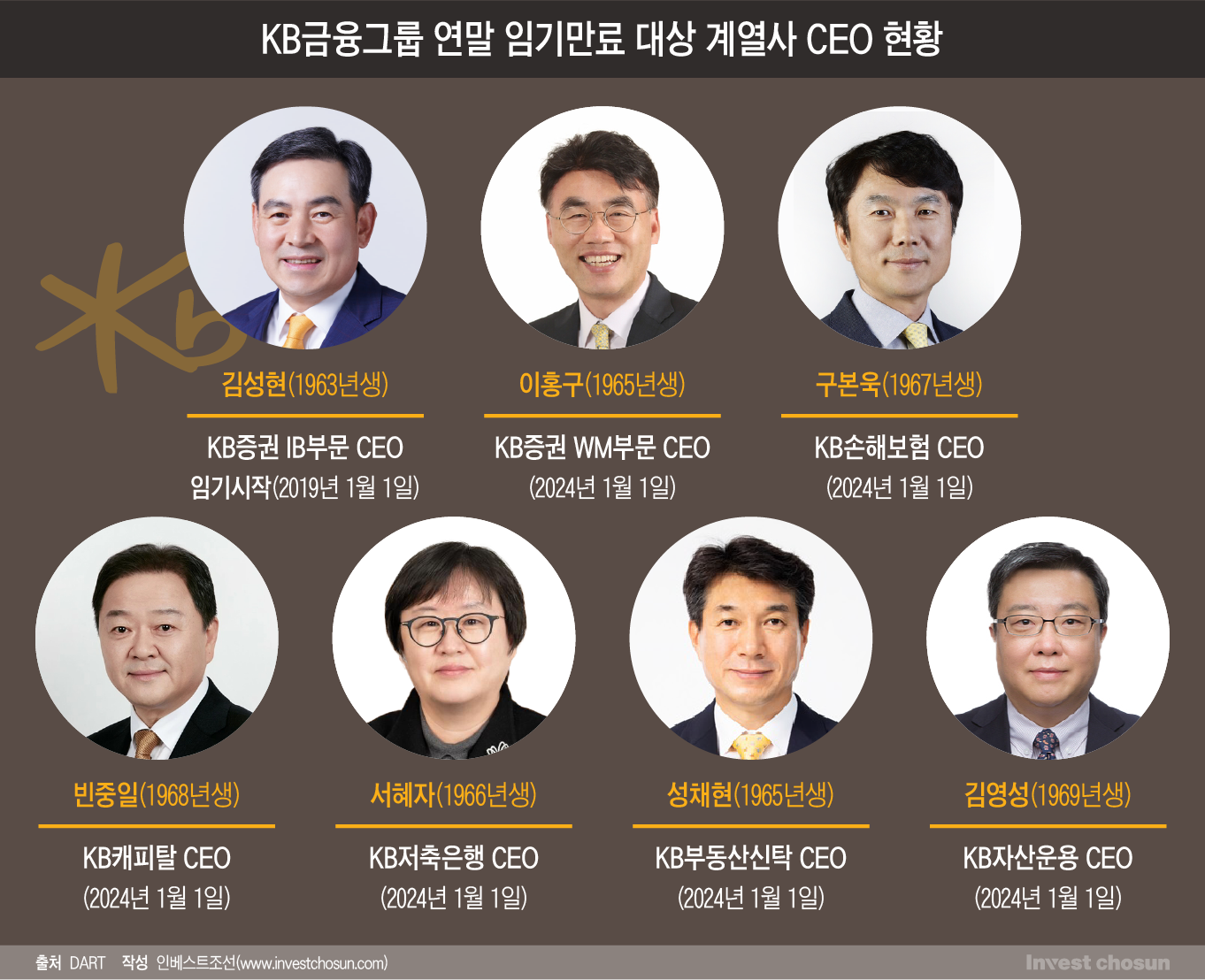 올해 CEO 임기가 만료된 계열사는 KB증권·KB손해보험·KB캐피탈·KB자산운용·KB저축은행·KB부동산신탁 등 6개 계열사다. KB증권이 공동대표 체제라는 점을 감안하면 심사 대상 CEO는 총 7명이다.