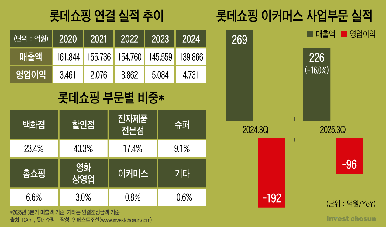 롯데온은 2025년 3분기 기준 여전히 적자 기조를 이어가고 있다. 적자 규모가 줄어들고 있지만, 2024년 4분기부터 e그로서리(식료품) 관련 손익을 기존 롯데온에서 그로서리 사업부로 변경해 반영하는 점을 고려하면 사실상 손실을 일부 마트·슈퍼 부문으로 이전한 것이라는 분석이 나온다. 매출도 분기마다 감소세를 보이며 외형 성장에 제동이 걸렸다는 평가다.