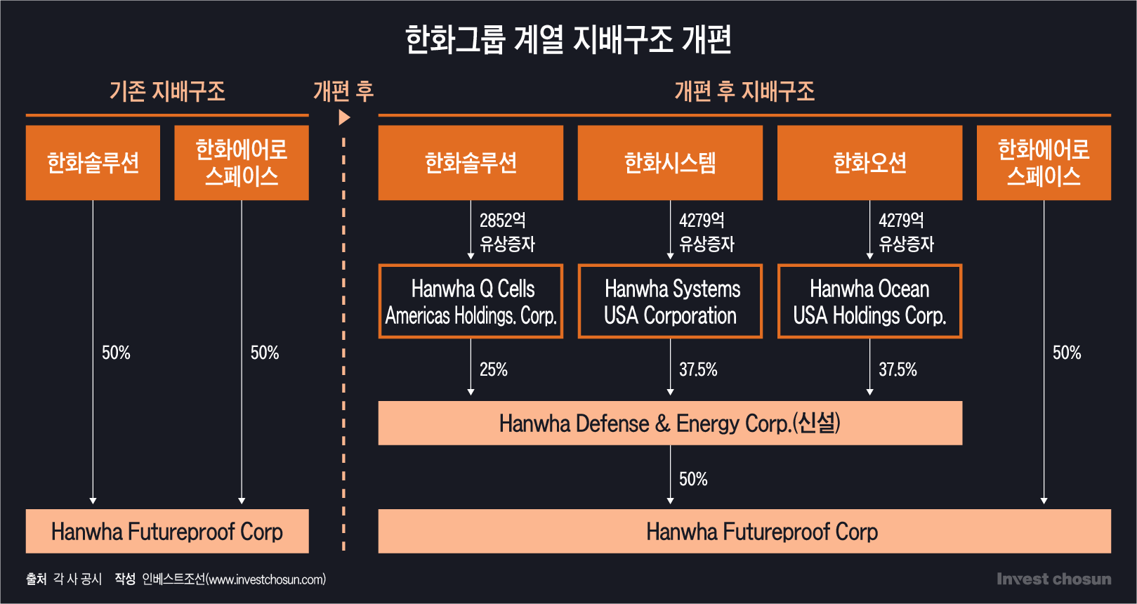 실제로 투자업계가 한화솔루션 유동성 문제를 지켜보던 차에 3개 계열사가 한화퓨쳐프루프 지분을 정리한다는 공시를 냈다. ▲한화솔루션은 한화퓨쳐프루프 지분 50%를 신설 해외법인 Hanwha Defense & Energy Corp.(HDE)로 매각하되 매각대금 일부를 재출자하고, ▲한화오션·한화시스템은 각각 해외법인을 거쳐 신설회사 증자에 참여하는 내용이다.