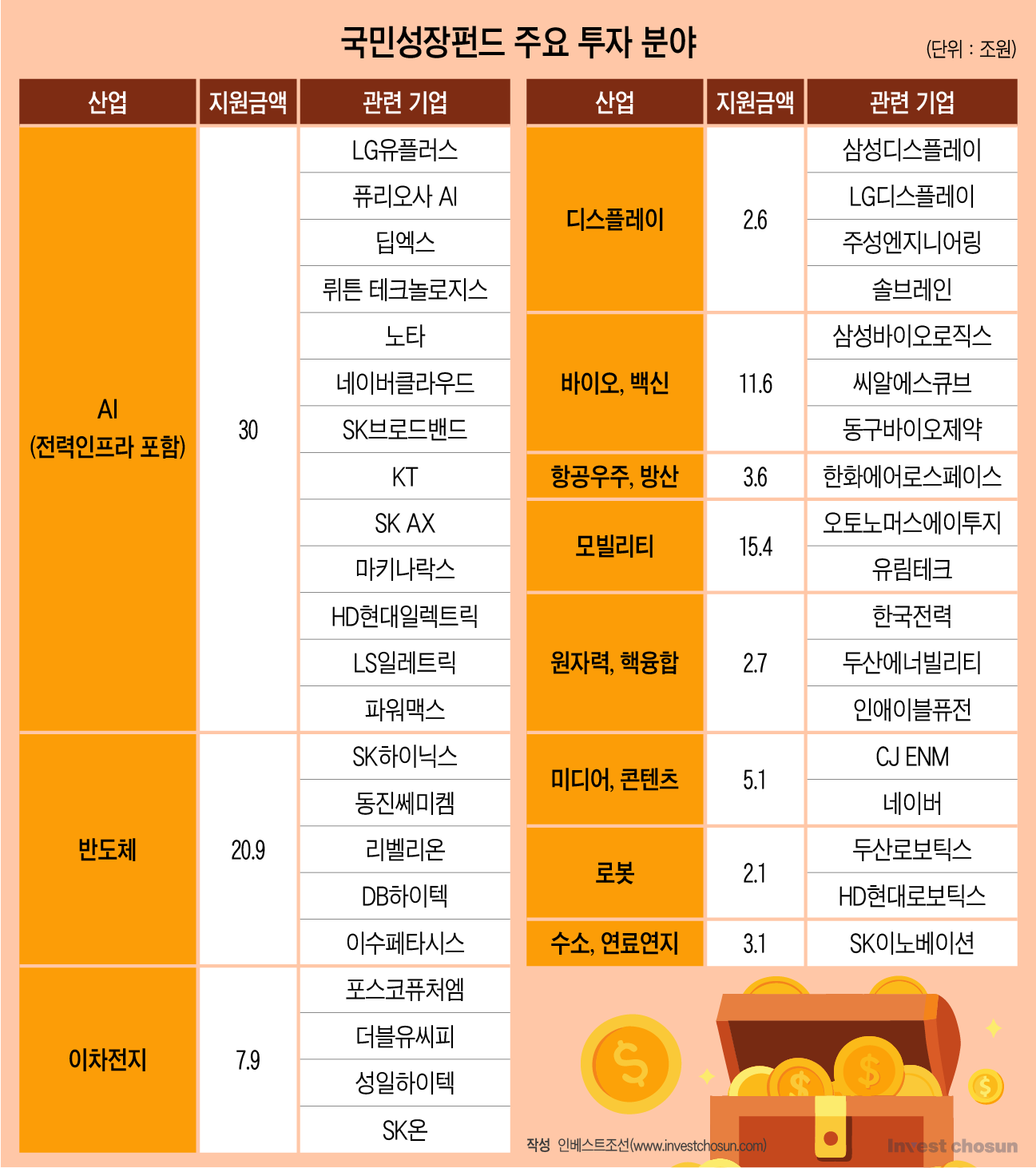 정부와 산업은행은 인공지능(AI), 반도체, 바이오·백신, 방산, 로봇, 수소, 이차전지, 디스플레이, 미래차 등 10개 첨단전략산업과 관련된 밸류체인 전반에 자금을 투입한다는 계획이다. 특히 제조업의 인공지능 전환(AX), 대규모 인프라·에너지 프로젝트, 지역산업 기반 확충, 스케일업 펀드 등 다양한 형태로 투자가 이뤄질 전망이다.