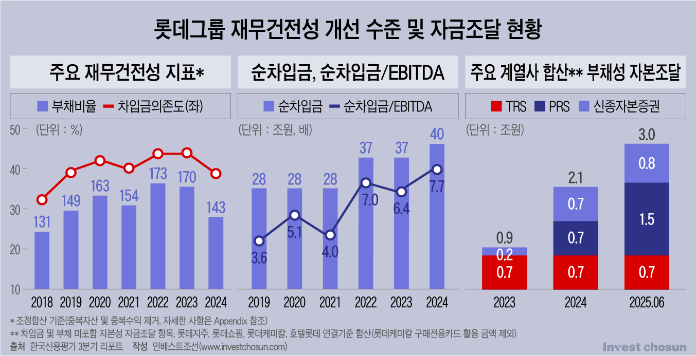 신용평가업계는 롯데그룹 내 자본성·채무성 조달 누적 규모를 약 3조원으로 추정하고 있다. 자산 재평가로 지표는 좋아졌어도, 영업현금 증가 없이는 긍정 효과가 유지되기 어렵다는 경고도 나왔다.