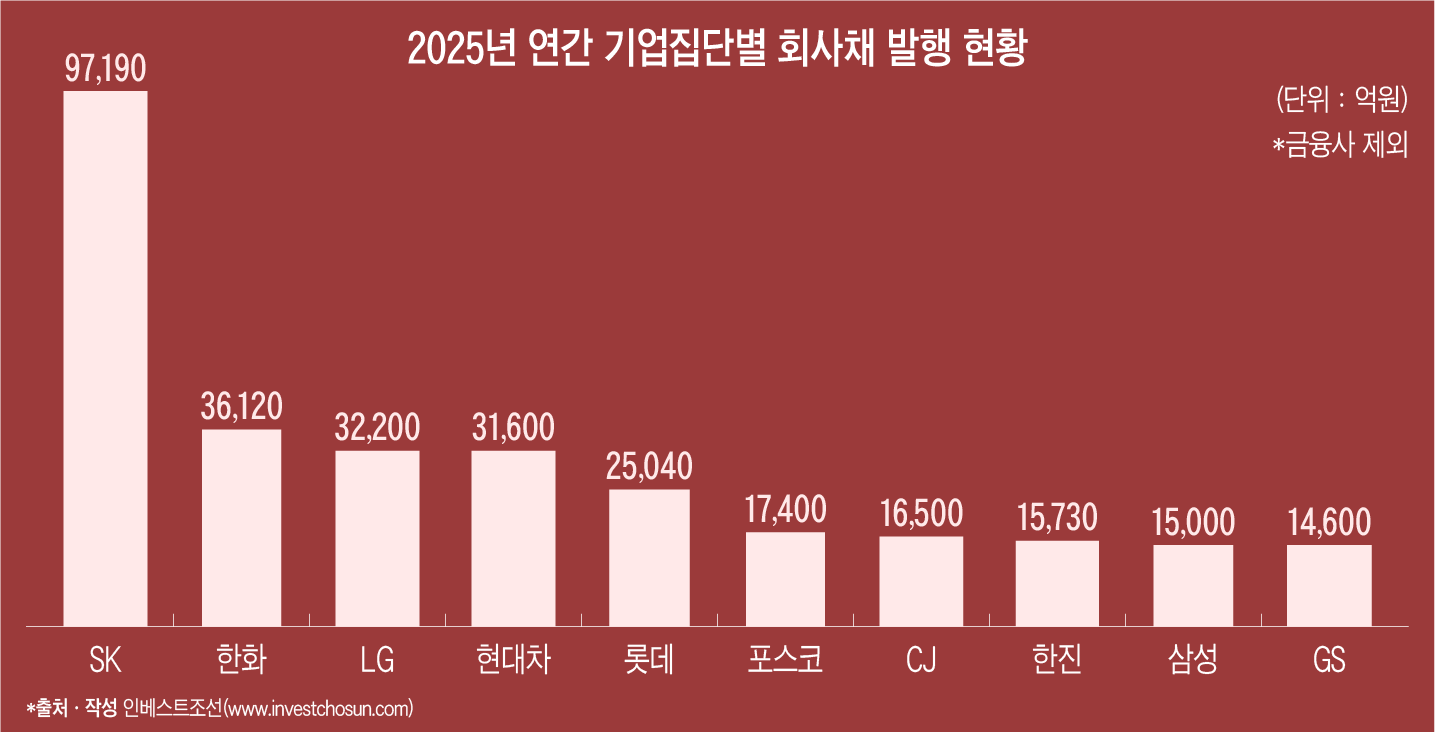 올해 SK그룹의 연간 공모 회사채 발행 규모는 9조7190억원으로, 9조8900억원을 기록했던 2023년 수준을 거의 회복했다. 지난해 발행액(7조3000억원)과 비교하면 2조원 이상 늘어난 수치다. 3조6120억원을 발행해 2위에 오른 한화그룹과 비교하면 격차는 3배에 달한다.