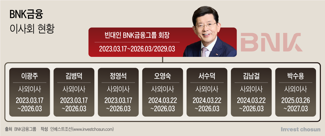 빈 회장의 지난해 보수는 8억8000만원으로 4대 금융지주 회장과 비교해도 낮지 않은 수준이지만, BNK금융의 주가는 PBR 0.3~0.4배로 금융지주 가운데 최하위권에 머물러 있다. 부산은행(26명)과 경남은행(25명)의 사외이사를 합산한 임원 수는 51명으로, 신한은행(29명)을 크게 웃돈다. 자산 규모는 시중은행의 5분의 1 수준에 불과하지만 임원 숫자는 더 많은 셈이다.