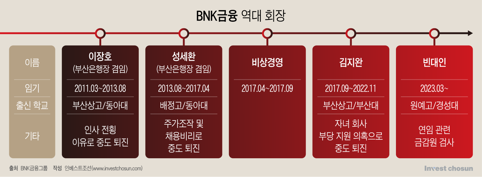 김 회장 취임 이후엔 부산대가 BNK금융의 주요 파벌로 자리잡았다. 빈대인 당시 부산은행장 역시 부산대 출신인 안감찬 전 행장으로 교체됐다. 비상경영 체제 당시 '계파색이 옅고 현장 경험이 많다'는 이유로 발탁된 빈 행장은 내부 평판이 나쁘지 않았지만, 임기를 4년도 채우지 못했다.