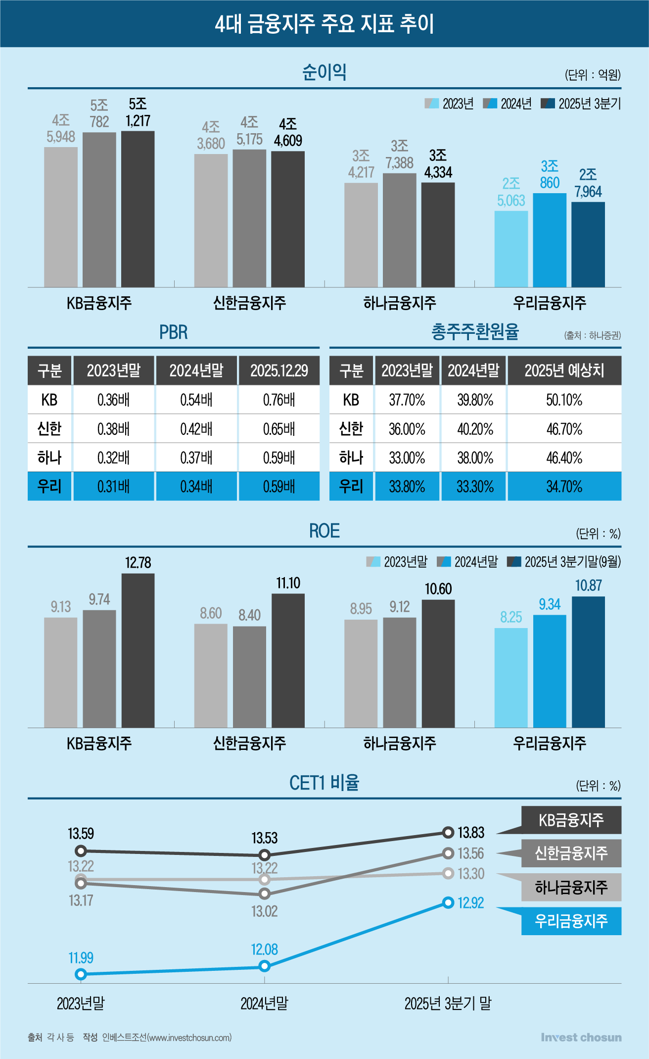 ROE(자기자본이익률) 기준에서도 상황은 크게 다르지 않다. 2024년 말 한때 신한금융을 앞섰지만, 올해 3분기 말 기준으로 다시 뒤처졌다. KB금융과의 격차는 더 확대됐고, 하나금융과는 엎치락뒤치락하는 수준에 머물러 있다. 동양생명 인수로 발생한 일회성 이익을 제거하면 ROE 역시 하나금융에 뒤진다는 평가가 나온다.