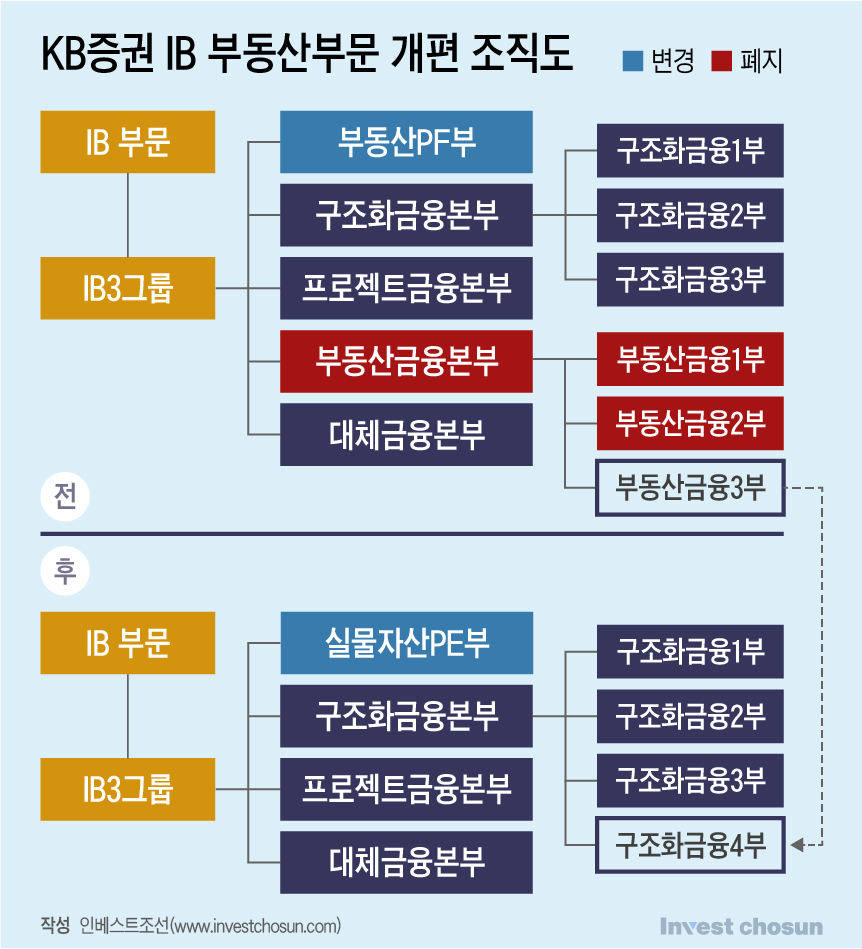 이에 KB증권 내부에서는 이번 개편을 두고 부동산 금융을 축소하기보다는 IB 전략에서의 위상을 재조정한 조치로 받아들이는 분위기다.