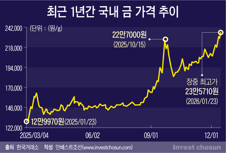 실제로 지난해 10월 대대적인 금 조정기 당시 국제 금 현물 가격은 일주일 사이 6.4% 하락했지만, 한국거래소에서 거래된 금 현물은 같은 기간 10% 가까이 하락하며 낙폭이 더 컸다. 국제 시세 대비 국내 가격이 높게 형성된 상태에서 조정이 나타나며 하락 폭이 확대된 결과다.