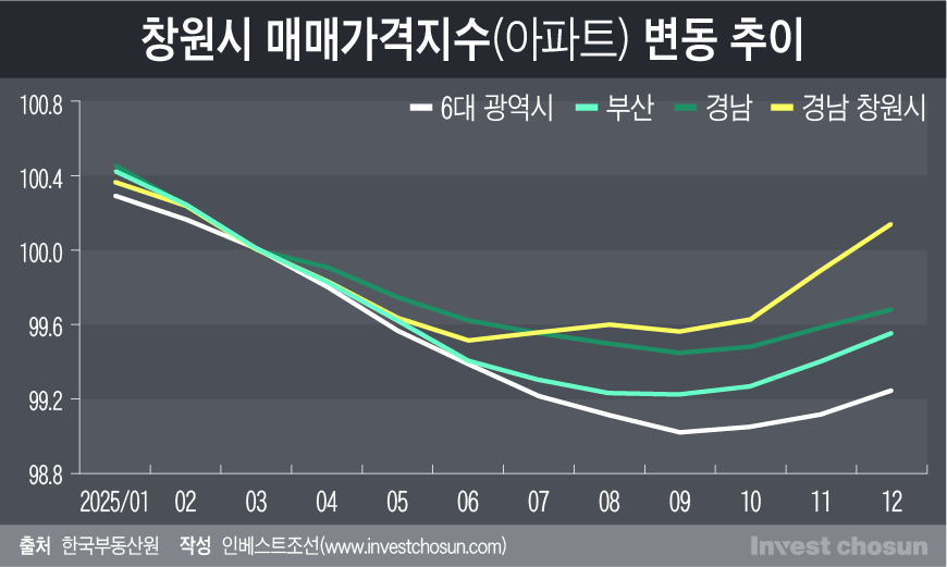 한국부동산원 통계에 따르면 창원시의 아파트 매매가격지수는 지난해부터 상승 추이가 뚜렷하다. 인근에 위치한 부산광역시, 경상남도와 6대 광역시의 평균치와 비교해도 높은 수치다.