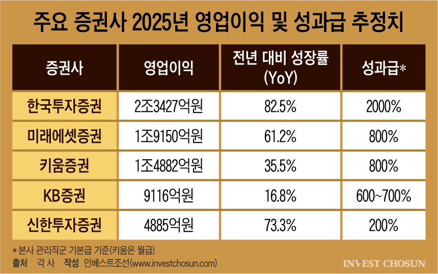 3월 말 주요 증권사들의 성과급 지급 시즌이 다가오면서 여의도 증권가가 들썩이고 있다. 지난해 증시 활황으로 주요 증권사의 2025년 연간 실적이 크게 개선되면서 성과급 규모도 확대될 것이란 기대가 커지고 있기 때문이다. 실제 일부 대형 증권사에서는 관리직 기준 성과급이 기본급의 2000% 수준까지 거론되고 있다.