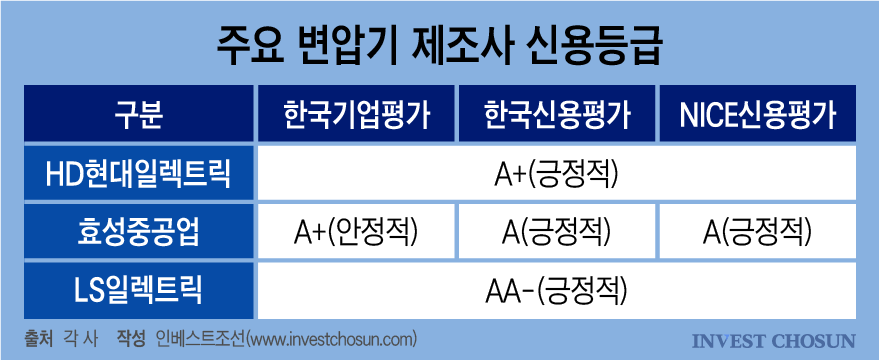 HD현대일렉트릭의 유효 신용등급은 A+(긍정적)이고 효성중공업은 A(긍정적), LS일렉트릭은 AA-(긍정적)다. 신용평가사들은 이익창출력 제고, 사업 다각화, 부채비율 하락 등을 3사의 등급 상향 조건으로 꼽고 있다. 모두 이런 조건을 이미 충족하거나 달성해가는 상황이라 3사의 신용등급 상향은 시간 문제란 평가가 나온다.