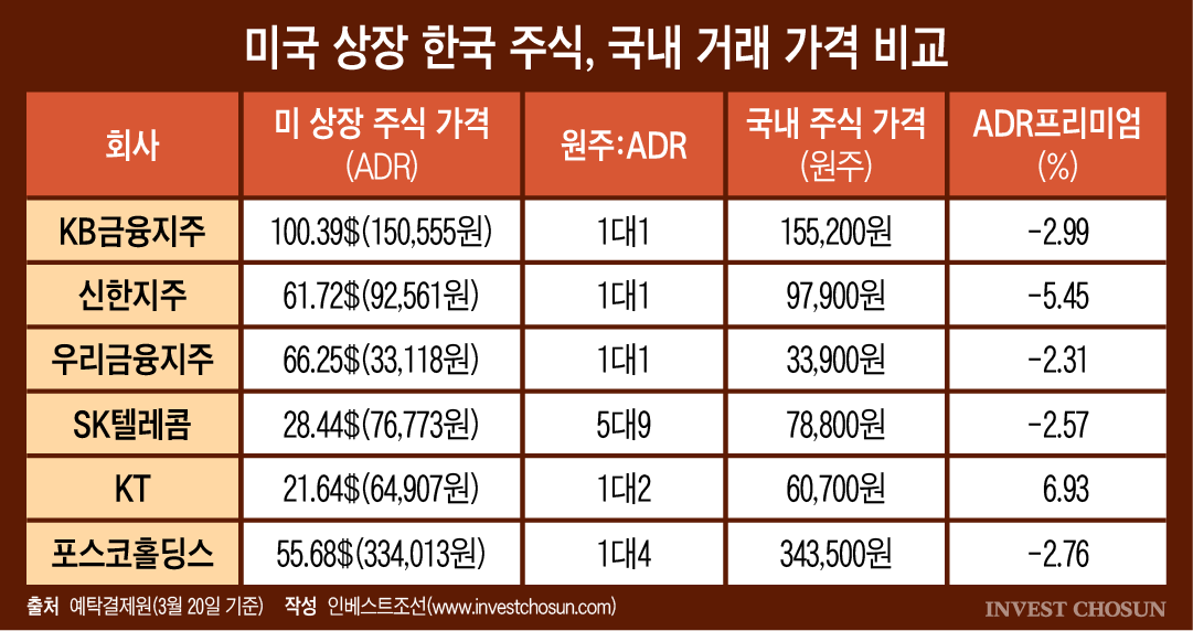 현재 미국에 상장된 국내 기업들의 성적표를 보면 '미국 프리미엄'은커녕 대부분 한국보다 싼 가격에 거래되고 있다. 지난 20일 기준 KB금융(-2.99%), 신한지주(-5.45%), 포스코홀딩스(-2.76%) 등은 모두 미국 가격이 한국보다 낮은 '디스카운트' 상태다. 이 격차를 이용해 미국 주식을 한국 주식으로 바꿔 파는 '역유입' 현상이 빈번하게 발생하는 이유다.