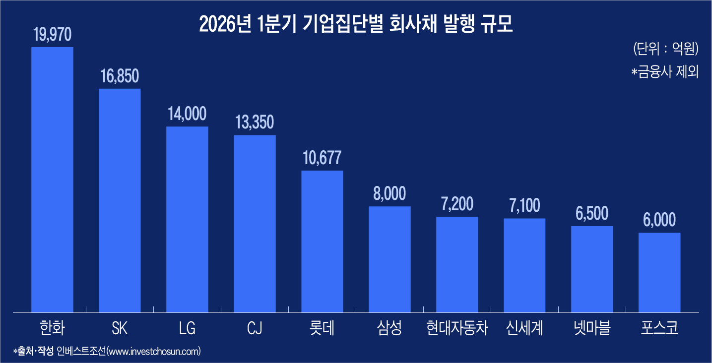 인베스트조선이 집계한 2026년 1분기 DCM 리그테이블에 따르면 한화그룹의 회사채 발행 규모는 총 1조9970억원으로 집계됐다. 전년 동기(1조5220억원) 보다 소폭 증가한 수준으로, 단일 그룹 기준 최대 이슈어로 부상했다.