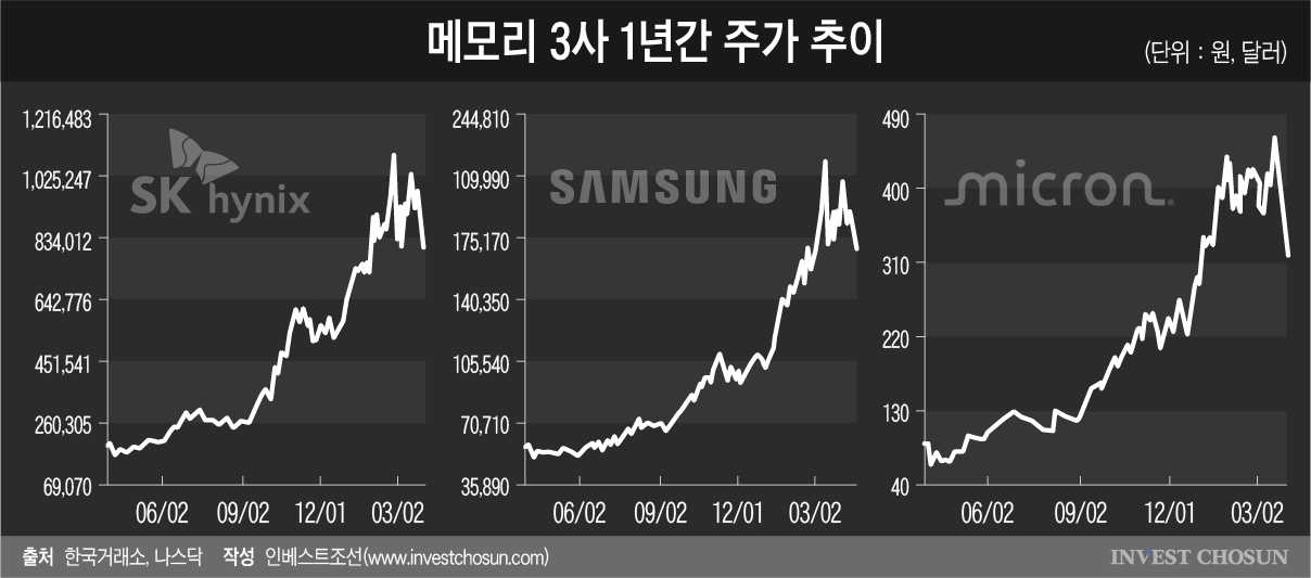 통상 업황이 꺾일 때는 현물가가 먼저 하락한 뒤 계약가로 인하 압력이 확산되는 경향이 있다. 전일 미국 마이크론 주가도 9.88% 하락하고 이날 SK하이닉스 주가가 전일보다 6% 이상 하락세를 보이는 것도 같은 맥락으로 풀이된다. 현재 메모리 사이클의 지속 가능성과 함께 삼성전자와 같은 공급사의 실적 추정에 대한 검증이 본격화하고 있다는 진단이 나온다.