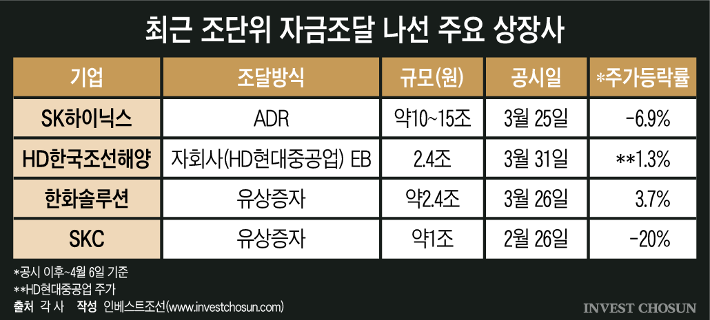 2026년 상반기 국내 자본시장이 ‘물량 부담(오버행)’ 우려에 휩싸였다. SK하이닉스, HD한국조선해양, 한화솔루션, SKC 등 시가총액 상위 기업들이 잇따라 조 단위 자금조달에 나서면서다. 과거 주가 상승기에 편승했던 ‘묻지마식 증자’와는 결이 다르지만, 강화된 주주 보호 눈높이를 충족하지 못할 경우 시장의 거센 반발을 피하기 어려울 전망이다.