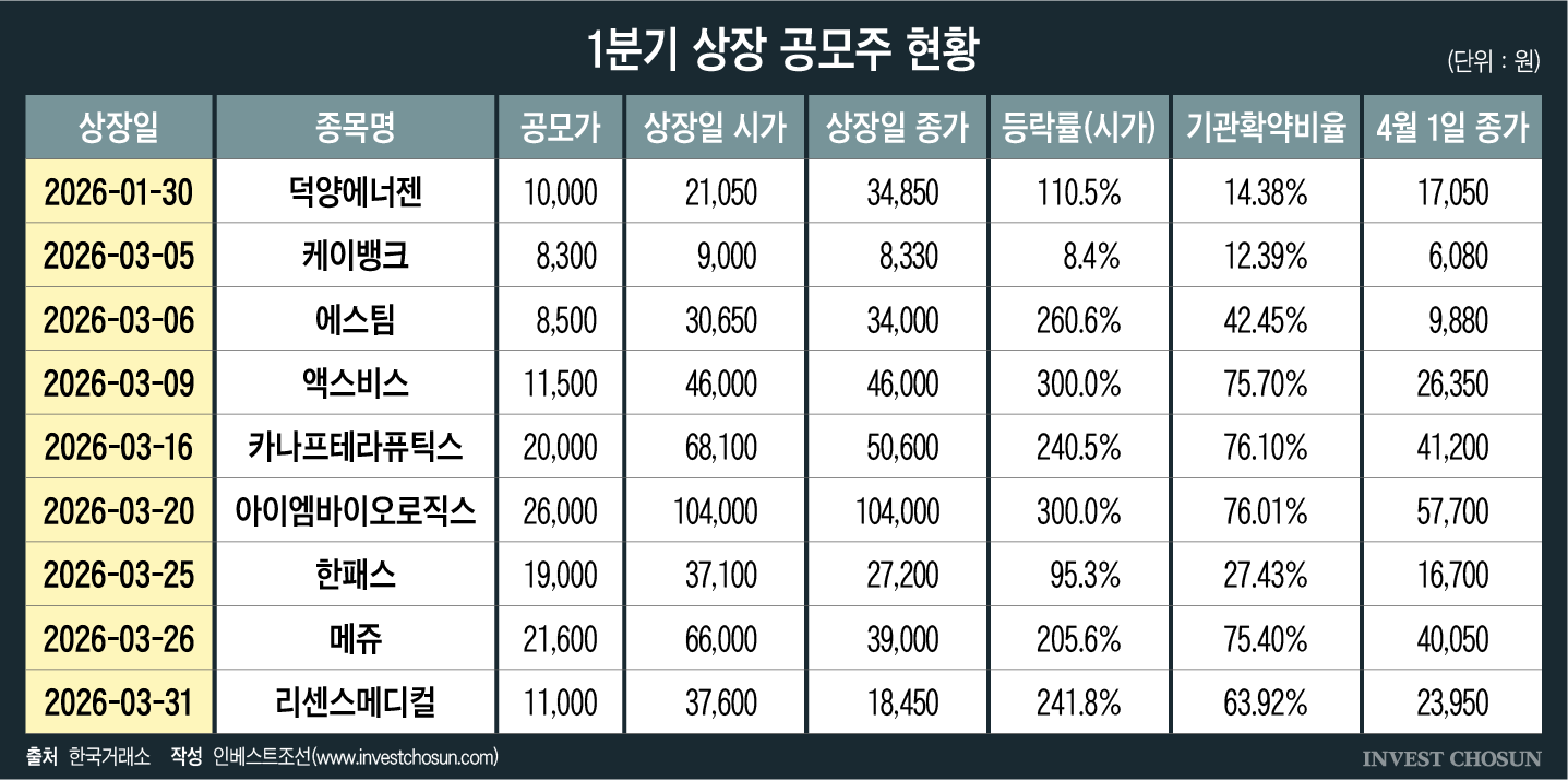 상장일 주가 급등은 기관 의무보유확약 비율과 맞물리는 모습이다. 시초가가 300% 수준에서 형성된 액스비스와 아이엠바이오로직스의 기관확약비율은 각각 75.7%, 76%로 집계됐다. 확약 물량이 늘어나면서 상장 당일 유통 가능 주식 수가 크게 줄었고, 이에 따라 장 초반 수급에 따라 주가가 급격히 움직였다는 분석이다. 실제 올해 1분기 평균 기관확약비율은 51.5%로, 지난해 같은 기간(18.8%) 대비 크게 상승했다.