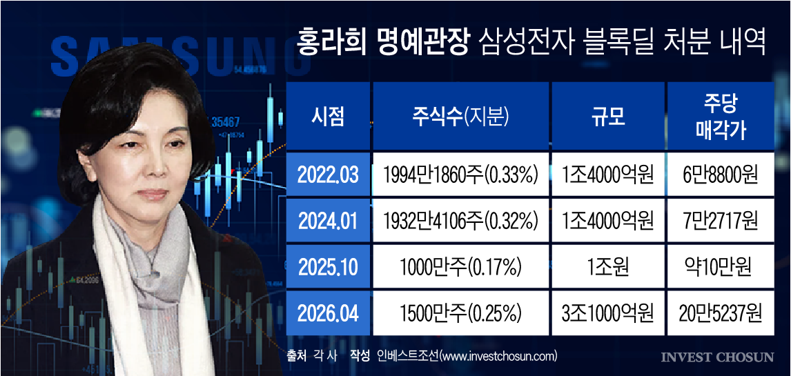 9일 투자은행(IB)업계에 따르면 홍 명예관장은 이날 오전까지 삼성전자 1500만주(지분율 0.25%)를 블록딜로 모두 처분했다. 거래 규모는 약 3조1000억원이다. 해당 거래는 씨티글로벌마켓증권, JP모건, 뱅크오브아메리카(BofA), UBS, 신한투자증권 등 5개사가 공동 주관사로 참여했다.